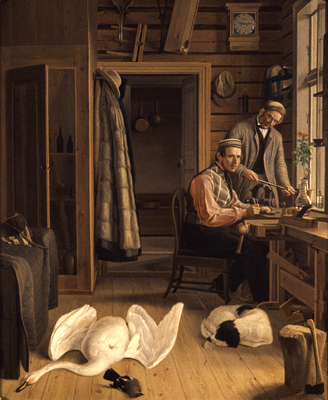 Ferdinand von Wrightin veli Wilhelm on kuvattu työhuoneessaan ruuvipenkin ääressä, vieressä seisoo aseen piippua tarkasteleva appi Olof Bildt.